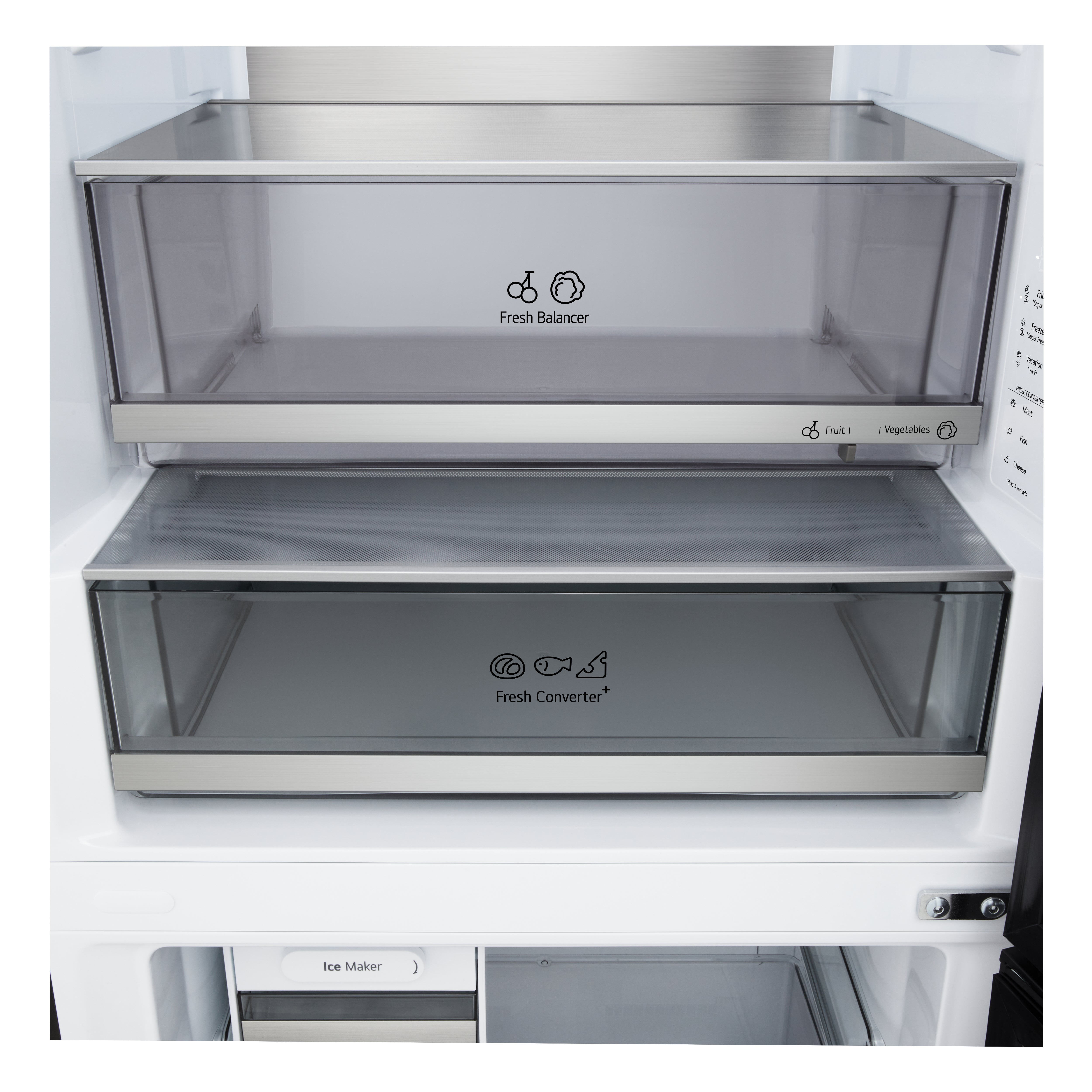 Tehnoloģijas: DoorCooling+™, LINEARCooling™, Metal Fresh, FRESH Balancer™, FRESH Converter™, Express Freeze, Zero Clearance eņģes, durvju atvēršanas brīdinājums, salokāms plaukts