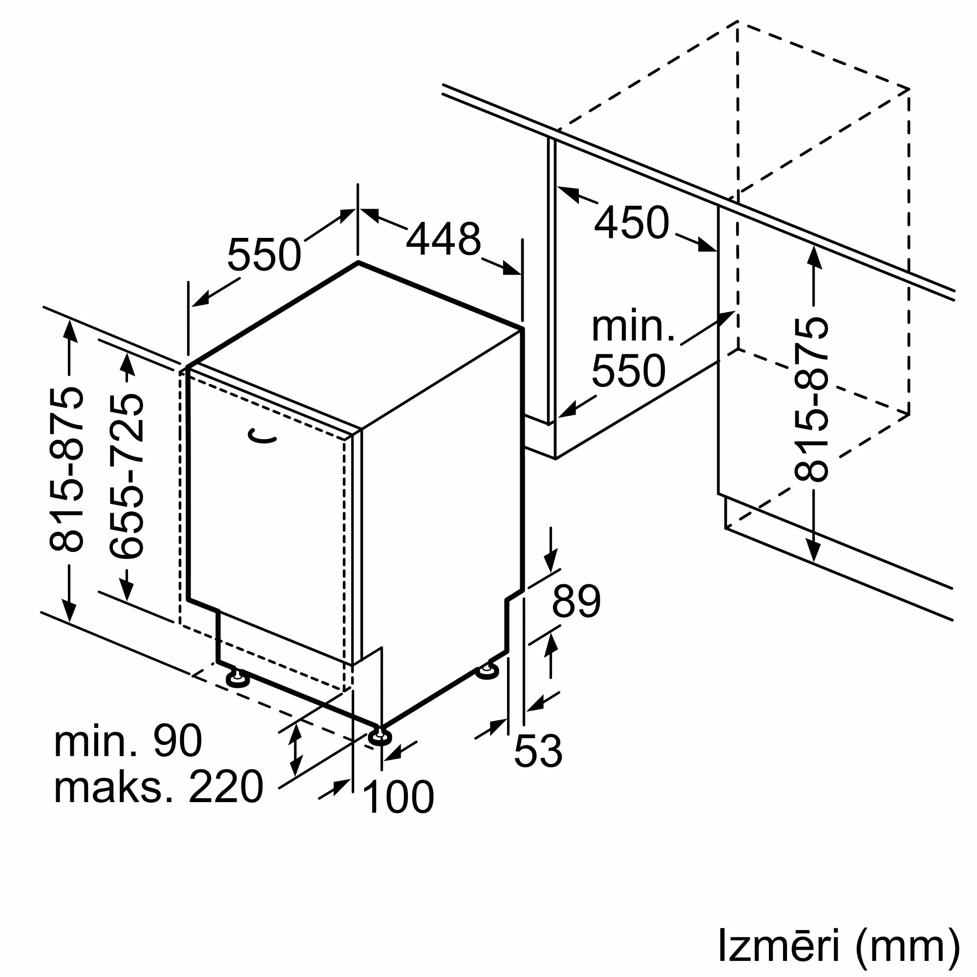 • Nepieciešamais nišas izmērs (AxPxD): 815–875 × 450 × 550 mm